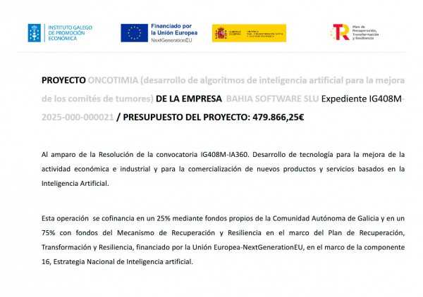 El proyecto ONCOTIMIA, busca desarrollar herramientas de IA generativa, con el objetivo de estructurar la información de cursos clínicos de la historia clínica electrónica de pacientes oncológicos y guías clínicas con el objetivo de proporcionar recomendaciones de tratamiento en los Comités de Tumores a través de Oncoteam, utilizando toda la información de nuevas tecnologías diagnósticas, biomarcadores y nuevas terapias y la información clínica del paciente.